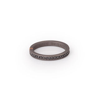 Bague pour homme en titane, diamants noirs et or rouge 18 carats. Réinterprétation de l'alliance classique, ce modèle est serti de 43 diamants noirs pour un poids total de 43 carats, jusqu'à l'insert en or rouge 18 carats. Le diamant noir d'1 carat, signature de la marque MANO|J, est présent. Une création qui allie légèreté, élégance et préciosité.